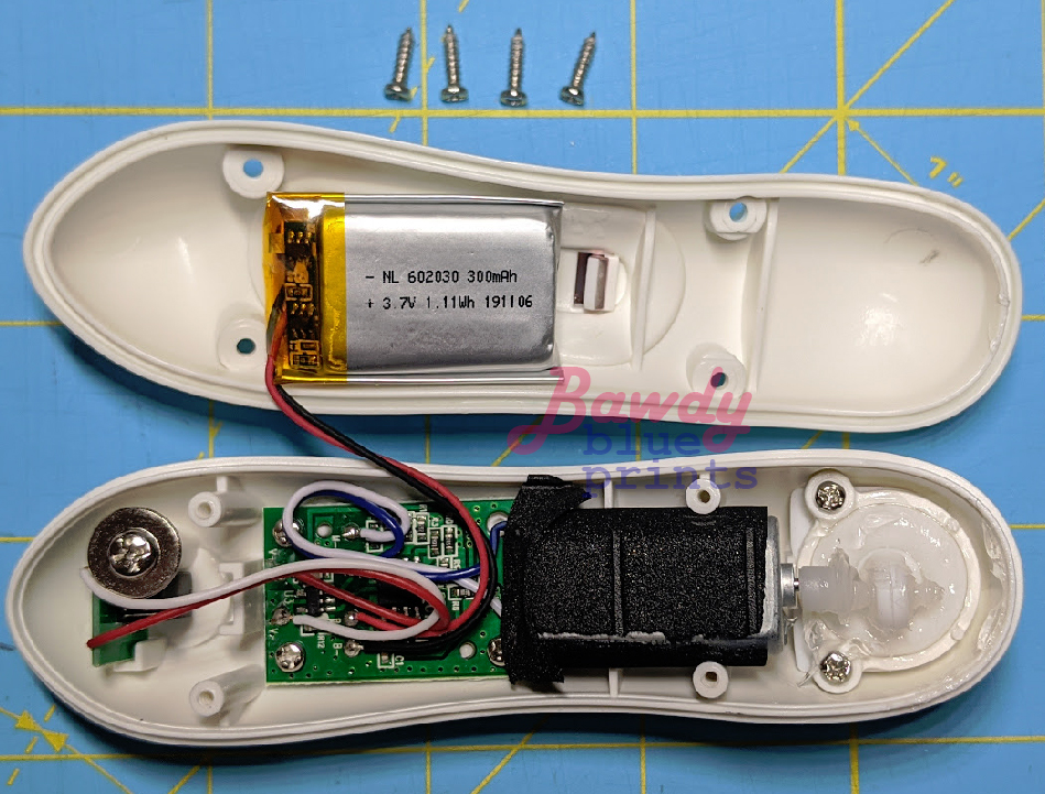 The minijack charging port is on its own board, held in by a screwed-down washer. The main board is attached with 3 screws. The motor has adhesive-backed foam for a press fit.