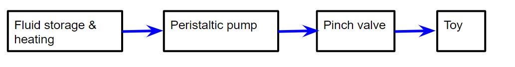 The software is written so that each pulse opens the valve for 200 ms before closing it again. (Of course, the movement of the servo takes some amount of time here as well, but not much.) The pump is left on continuously. The timing between the pulses starts at 0.6 seconds, and increases 0.1 second with each pulse. This regime is taken from an Archives of Sexual Behavior paper. In both gifs on this page, the total is 5 mL simulant in 9 pulses.