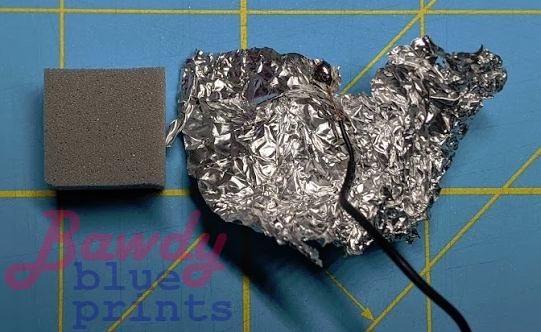 A line soldered to aluminum foil and wrapped around a 1.5 cm cube of foam gives us our capacitive touch ability in the tip.