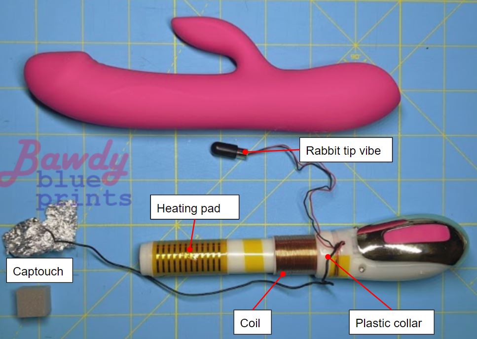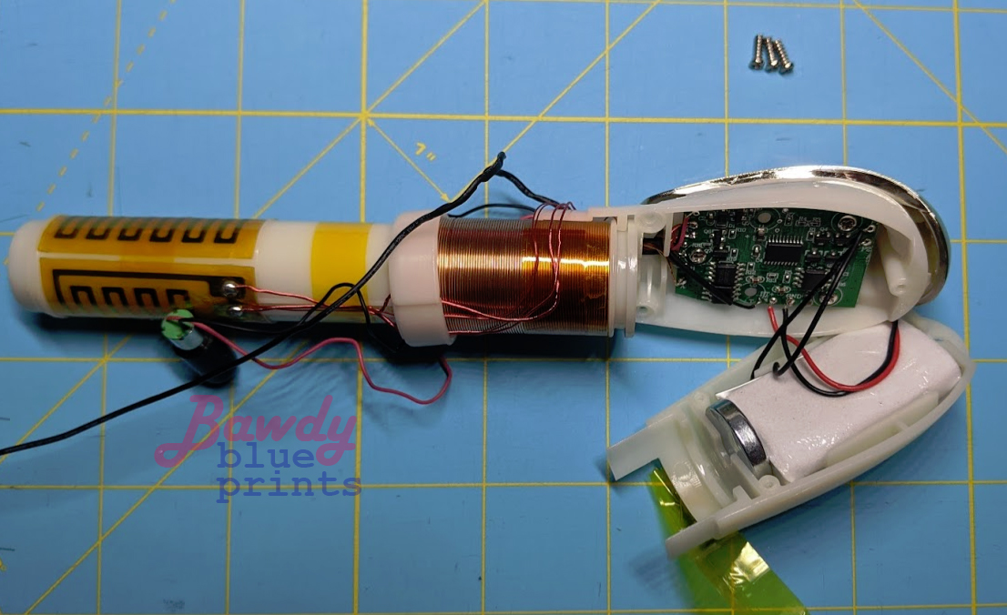 After removing the silicone shell, there are still wires running to two components inside: the vibe in the rabbit tip, and a captouch sensor in the front tip- when powered on, the device turns on and off when the tip contacts skin.
