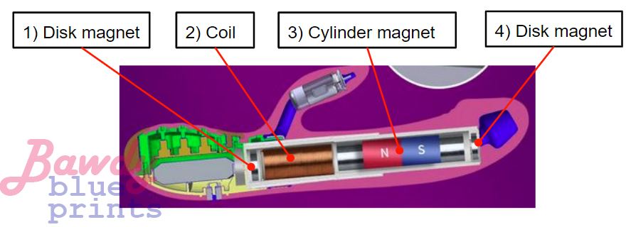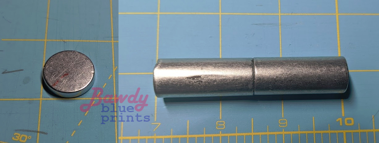 #1, the handle / disk magnet, is 4 mm thick and 18 mm in diameter. The cylinder magnet is actually two that have been glued together; each is 36mm long, for a total of 72 mm in length; they are 15 mm in diameter. The magnets will pull themselves together when about 1.5" inches apart. There is another disk magnet in the tip (#4), which is smaller in diameter to the other disk; this one is about 15 mm in diameter and between 4 and 5 mm thick. The coil wire is about 0.5 mm in diameter, and the coil diameter is 22 mm with a length of 38 mm. The magnets are installed such that the poles are in opposition to the cylinder magnet; they both push away from it so that it is floating inside.